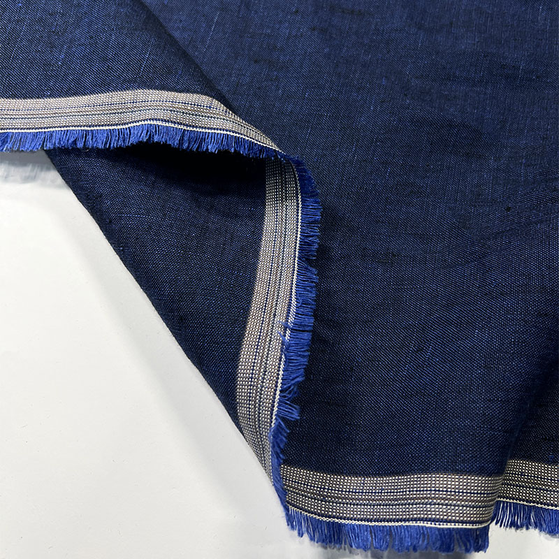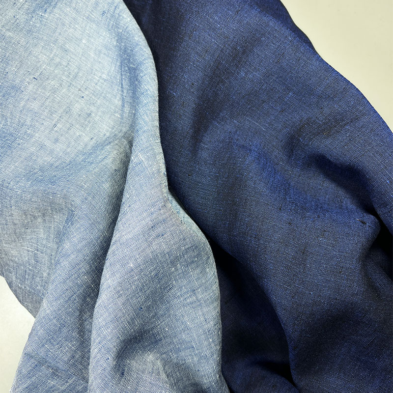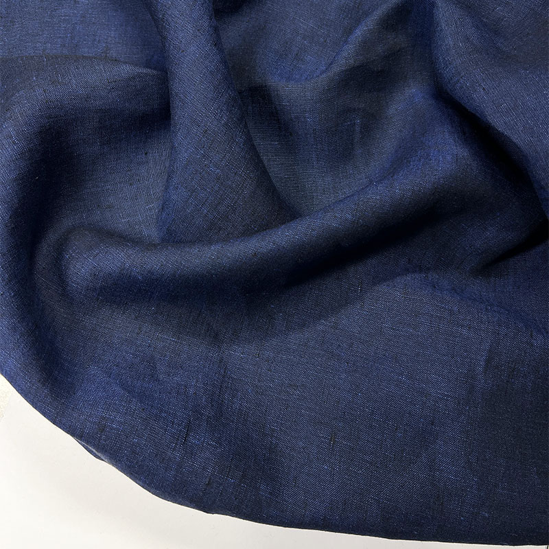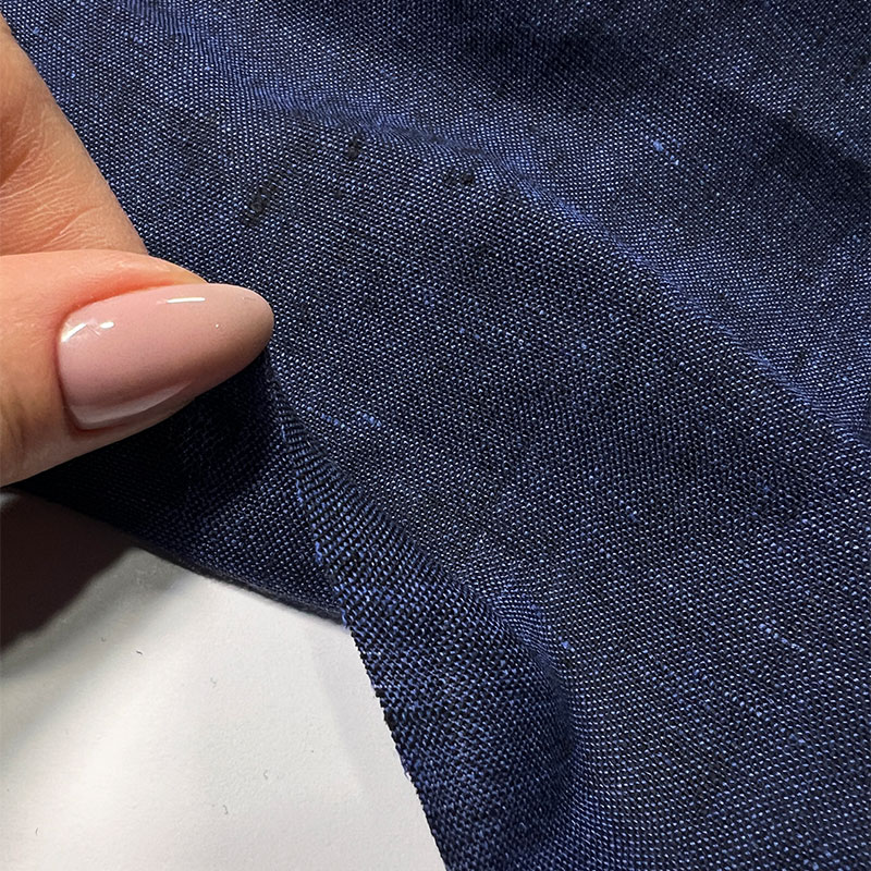 Характеристики - костюмный лён благородной меланжевой фактуры. Полотно соткано из двух нитей — чёрной и глубокой синей, благодаря чему образуется сложный, насыщенный оттенок тёмного индиго. Цвет выглядит живым и многогранным, с характерной природной глубиной льна. Ткань двухсторонняя, с одинаково красивой фактурой с обеих сторон. Материал непрозрачный, хорошо держит форму и при этом сохраняет естественную мягкость и воздухопроницаемость натурального льна