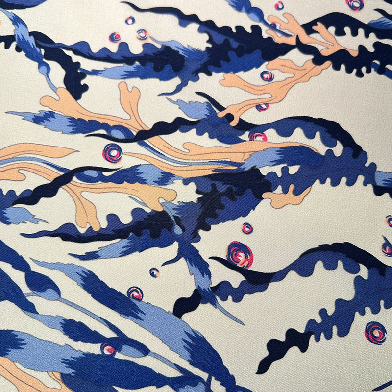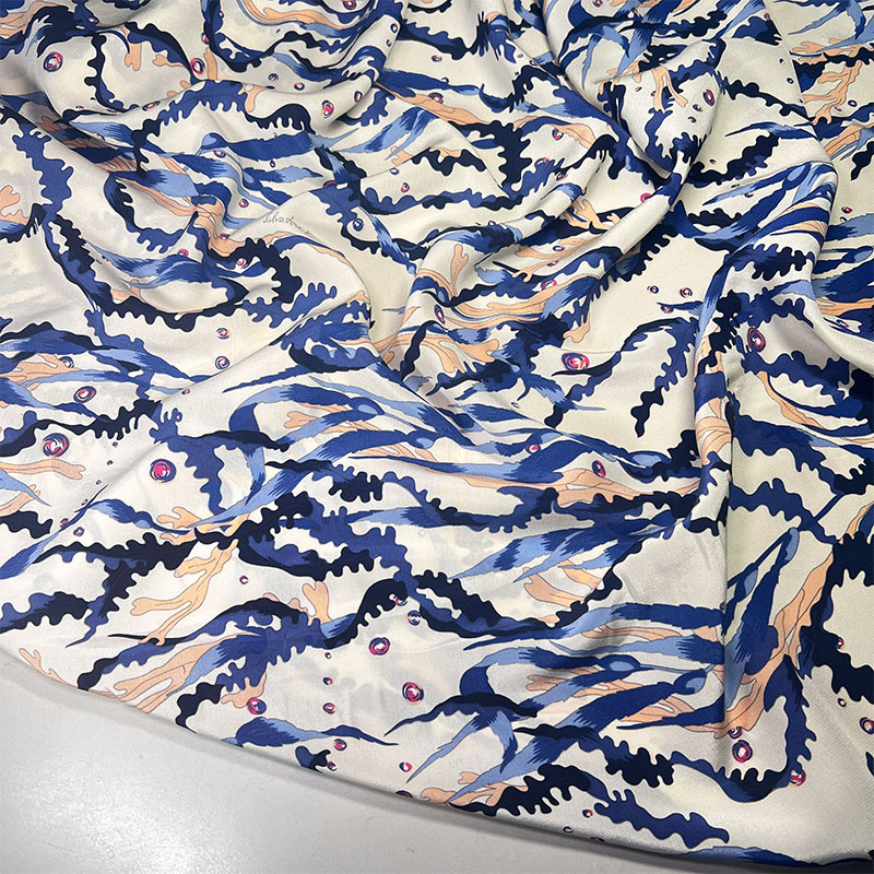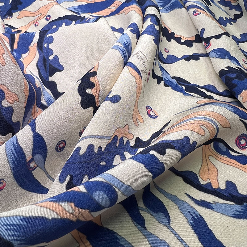 Характеристики - ткань отличается характерной для крепдешина мягкой зернистой фактурой и благородной матовой поверхностью. Легкий, пластичный и струящийся шёлк красиво драпируется, образуя мягкие складки и подчеркивая движение ткани. Принт выполнен в художественной морской палитре — глубокие оттенки синего переплетаются с молочно-кремовым фоном и акцентами теплого песочного цвета, создавая эффект живого рисунка, напоминающего морские течения и коралловые формы