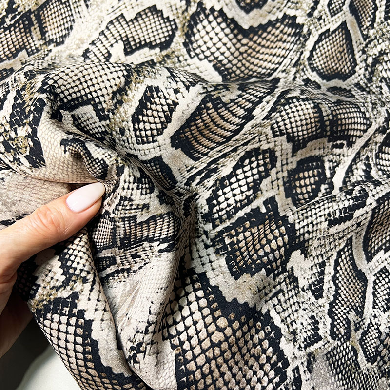 Коментар стиліста:  тканина з легким еластичним ефектом, матовий стрейч-шовк, що струмує, не просвічує, комфортно відчувається на шкірі завдяки природній м'якості волокон. Ідеальний для виробів, які потребують пластики та чистої посадки. Рекомендуємо сукні з драпіруванням, асиметричні топи, спідницю-олівець, блузу, ефектні вечірні комплекти. Принт працює як самостійний акцент - образ відразу виглядає продумано та преміально. Найкраще розкривається у виробах із вільною або м'яко приталеною посадкою, красиво формує V-вирізи та асиметрію. Поєднується з однотонними тканинами різних фактур – льоном, шовком, вовною