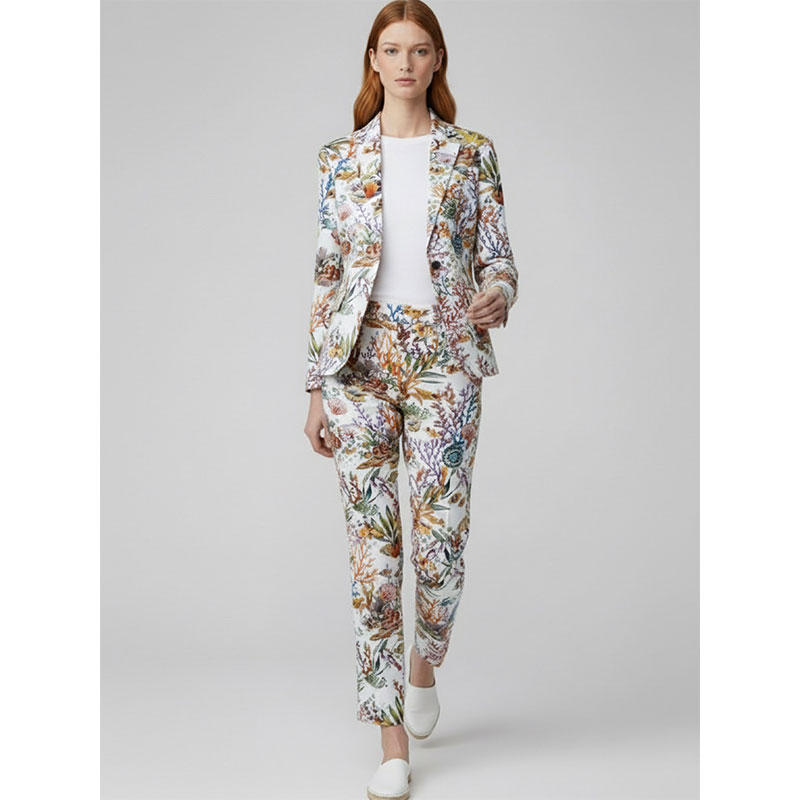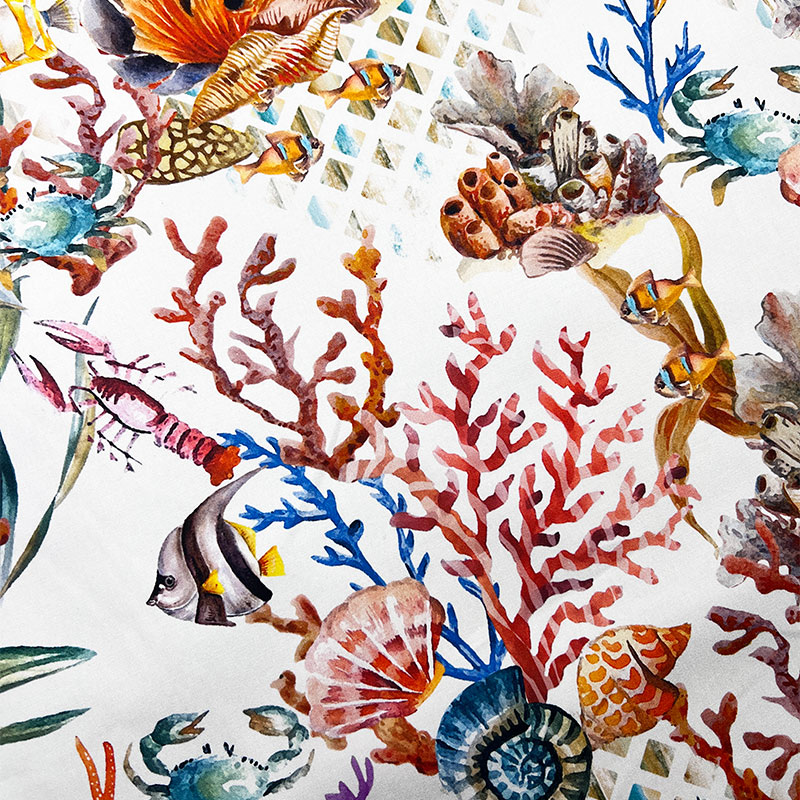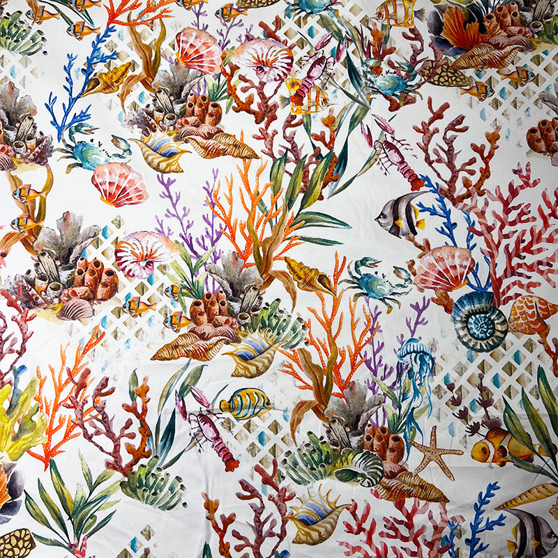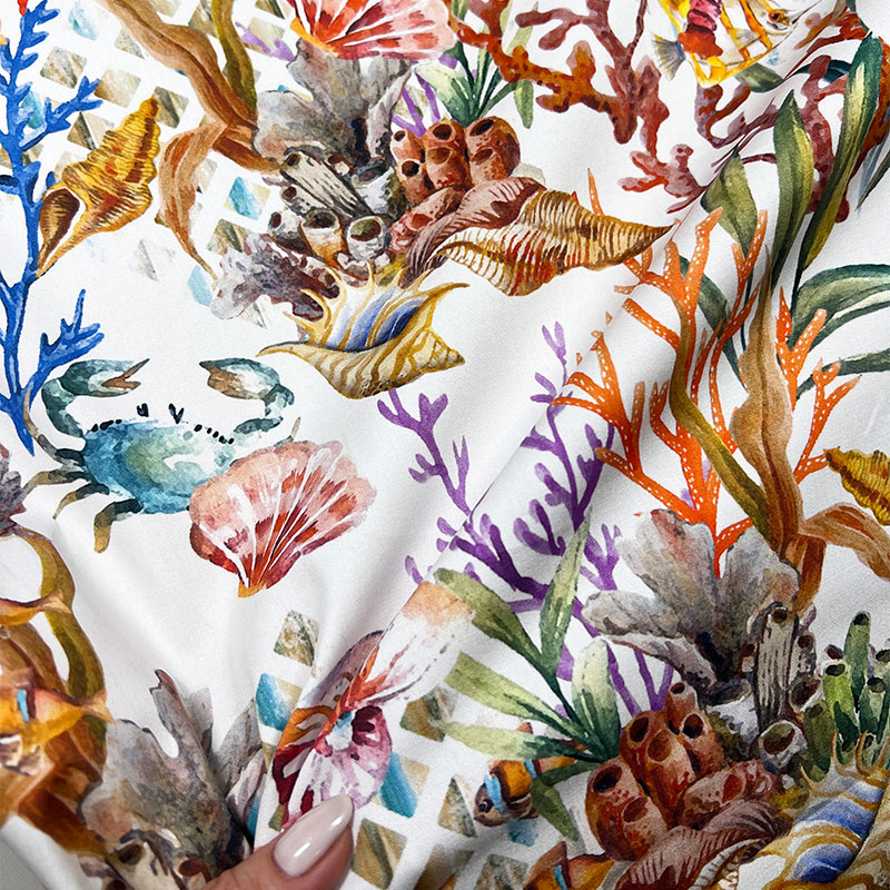 Коментар стиліста: ця тканина звучить як відпустка на узбережжі — яскраво, барвисто, позитивно, стильно, жіночно. Особливо ефектно розкривається в лаконічних силуетах, де принт стає головним акцентом образу. Ефектний коттон стрейч із художнім морським принтом, ніби перенесеним із акварельної ілюстрації. На молочному фоні оживають корали, раковини, тропічні риби та морські силуети, створюючи виразне шляхетне полотно