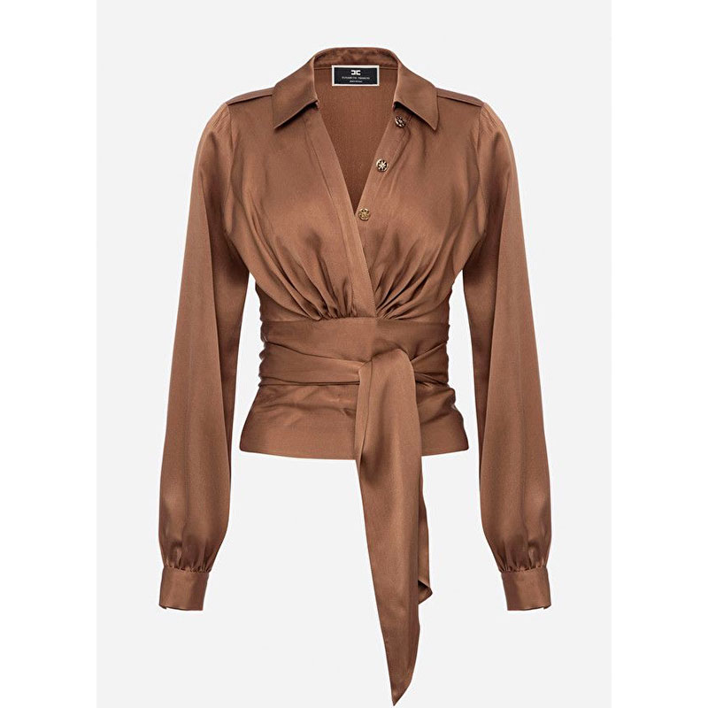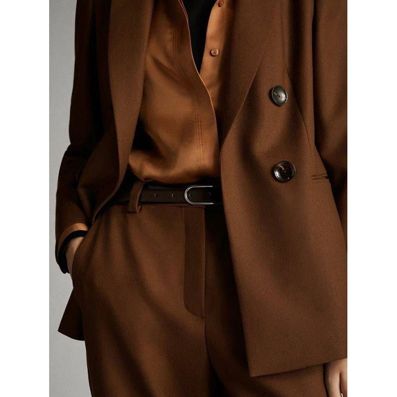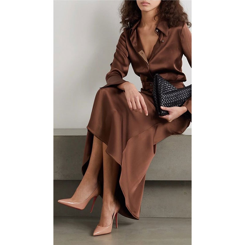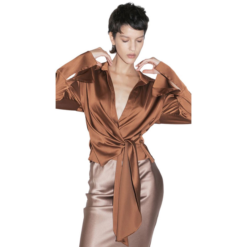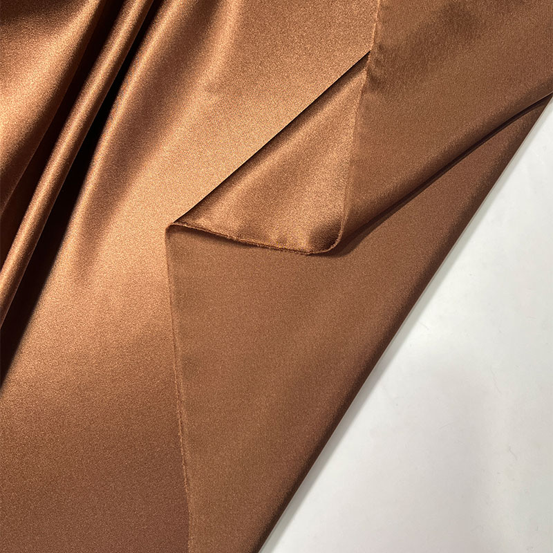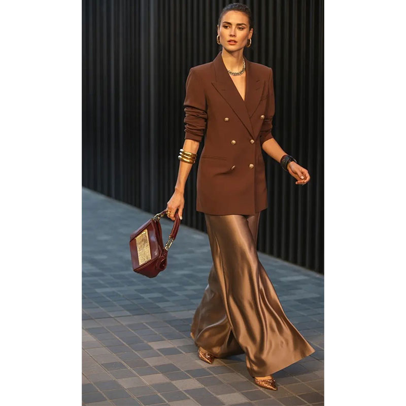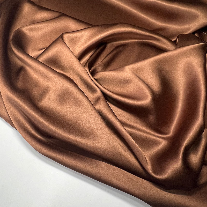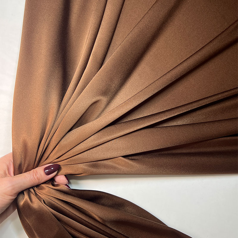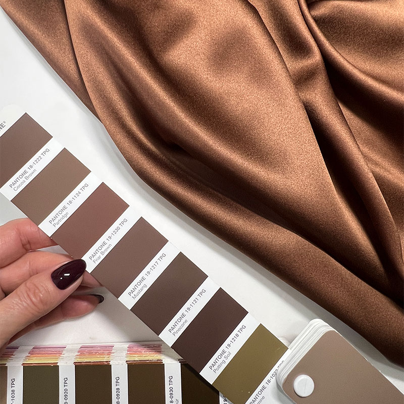 Коментар стиліста: сатиновий однотонний шовк є базовим у гардеробі. Він, як чисте полотно, з якого можна створювати як прості та лаконічні, так і кутюрні вироби, а у поєднанні з мереживом – розкішну білизну, пеньюар, домашній одяг. Ця тканина розкривається у виробах, що підкреслюють пластику тіла та чистоту ліній крою. Шовк із відтінком шоколаду з теплим бронзовим підтоном - насичений, глибокий, з м'яким атласним блиском. Залежно від освітлення грає нюансами какао та міді, створюючи відчуття тепла, витонченості, шляхетності. Шовковий сатин стрейч у шоколадному відтінку – втілення сучасних модних тенденцій. Він надає образу глибину та м'яке сяйво, як у колекціях The Row та Max Mara. Відмінно поєднується з вовняним жакетом, шкіряним поясом та аксесуарами у теплому металі