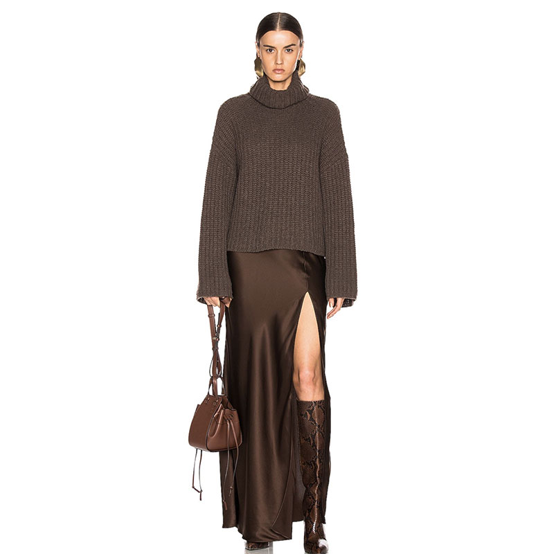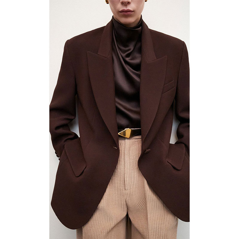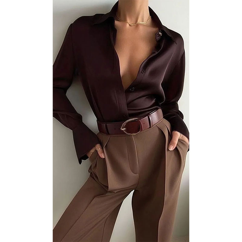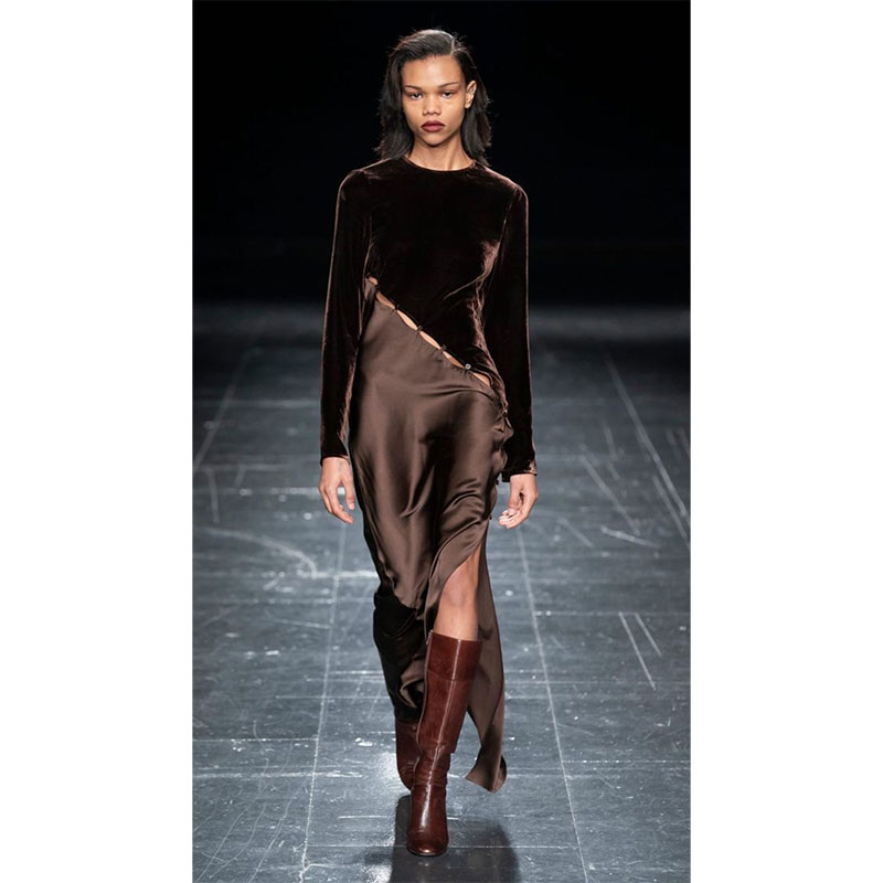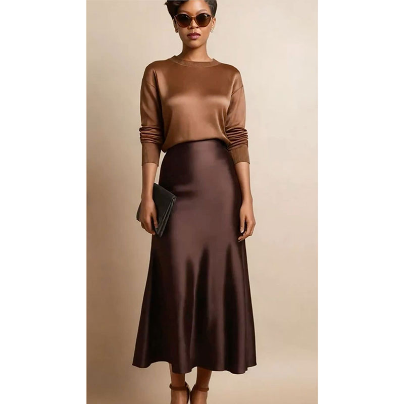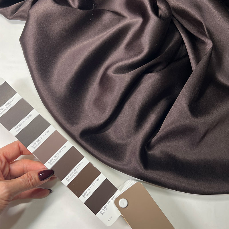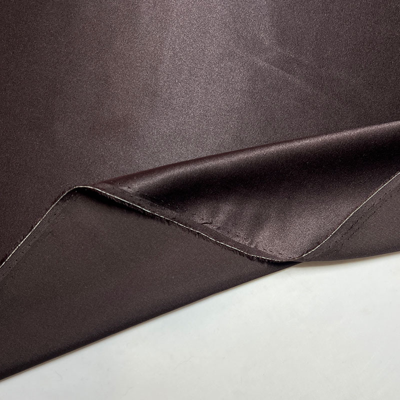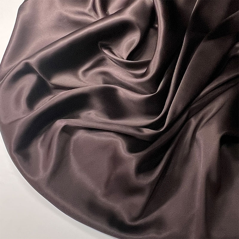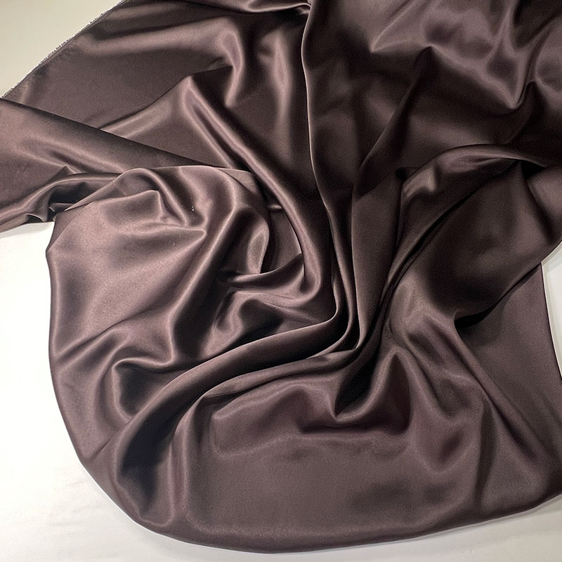 Коментар стиліста: сатиновий однотонний шовк є базовим у гардеробі. Він, як чисте полотно, з якого можна створювати як прості та лаконічні, так і кутюрні вироби, а у поєднанні з мереживом – розкішну білизну, пеньюар, домашній одяг. Ця тканина розкривається у виробах, що підкреслюють пластику тіла та чистоту ліній крою. Шовк із відтінком темного шоколаду - насичений, глибокий, з м'яким атласним блиском.  Шовковий сатин стрейч у шоколадному відтінку – втілення сучасних модних тенденцій. Він надає образу глибину та м'яке сяйво, як у колекціях The Row та Max Mara. Відмінно поєднується з оксамитом, твідом, с вовняним костюмом