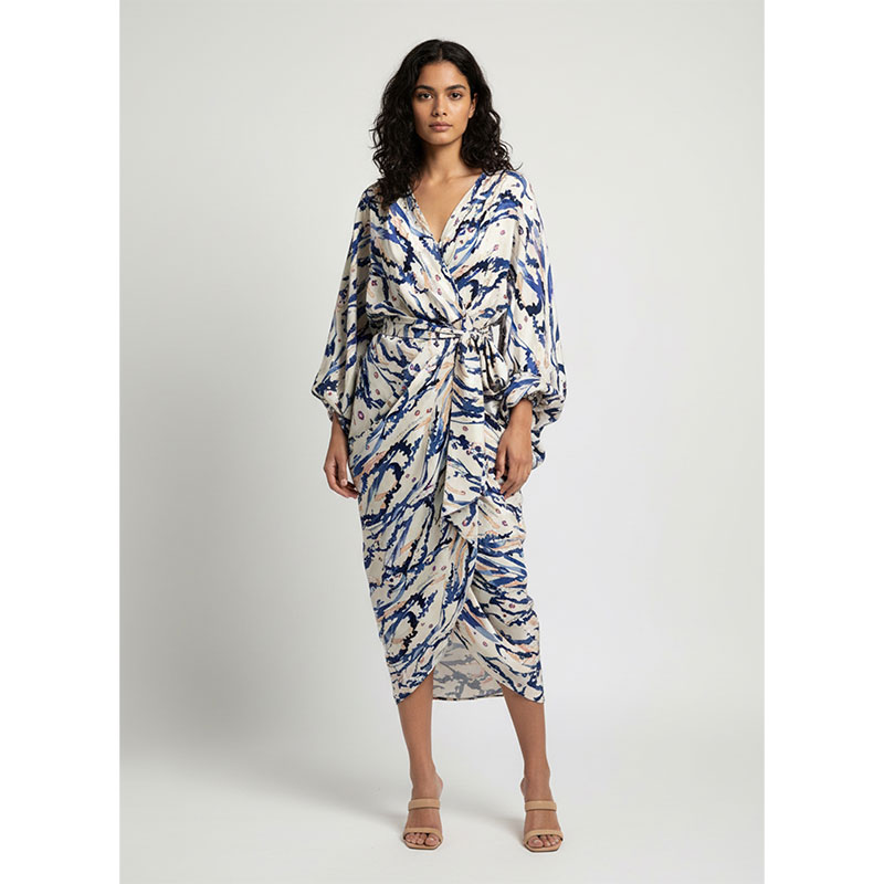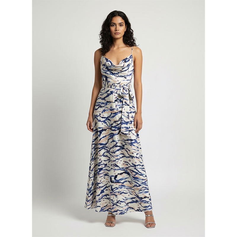 Характеристики - тканина відрізняється характерною для крепдешина м'якою зернистою фактурою та благородною матовою поверхнею. Легкий, пластичний і шовк, що струмує, красиво драпірується, утворюючи м'які складки і підкреслюючи рух тканини. Принт виконаний у художній морській палітрі — глибокі відтінки синього переплітаються з молочно-кремовим фоном та акцентами теплого пісочного кольору, створюючи ефект живого малюнка, що нагадує морські течії та коралові форми.