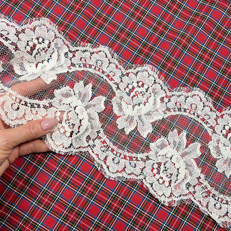 Характеристики - непрозора, тонка, гладка і м'яка тканина з натуральної бавовни з делікатною, але щільною структурою. Матеріал приємний до тіла, добре пропускає повітря і тримає форму, залишаючись при цьому пластичним у драпіруванні. Поверхня матова, з акуратним переплетенням ниток, завдяки чому картатий малюнок виглядає чітко та графічно. Яскрава червона шотландська клітина надає тканині характеру і виразності, зберігаючи шляхетну стриманість класичного текстилю. Тканина комфортна для повсякденного та дизайнерського одягу